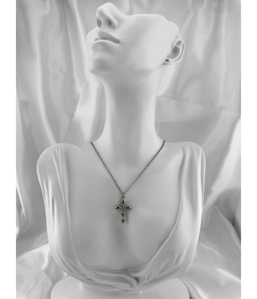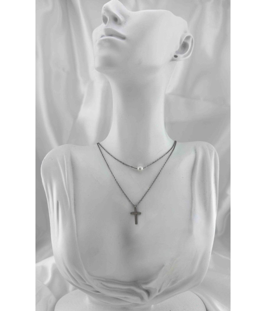 Ασημί ατσάλινο διπλό κολιέ με ζιργκόν και σταυρό, κομψό και μοντέρνο.