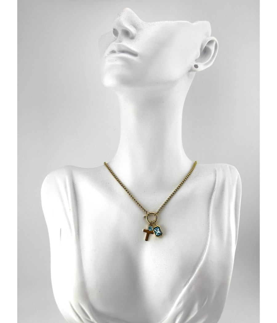 Κολιέ Κωνσταντινάτο με σταυρό και ζιργκόν σε λευκό ή μπλε, για κομψότητα και πνευματικότητα.