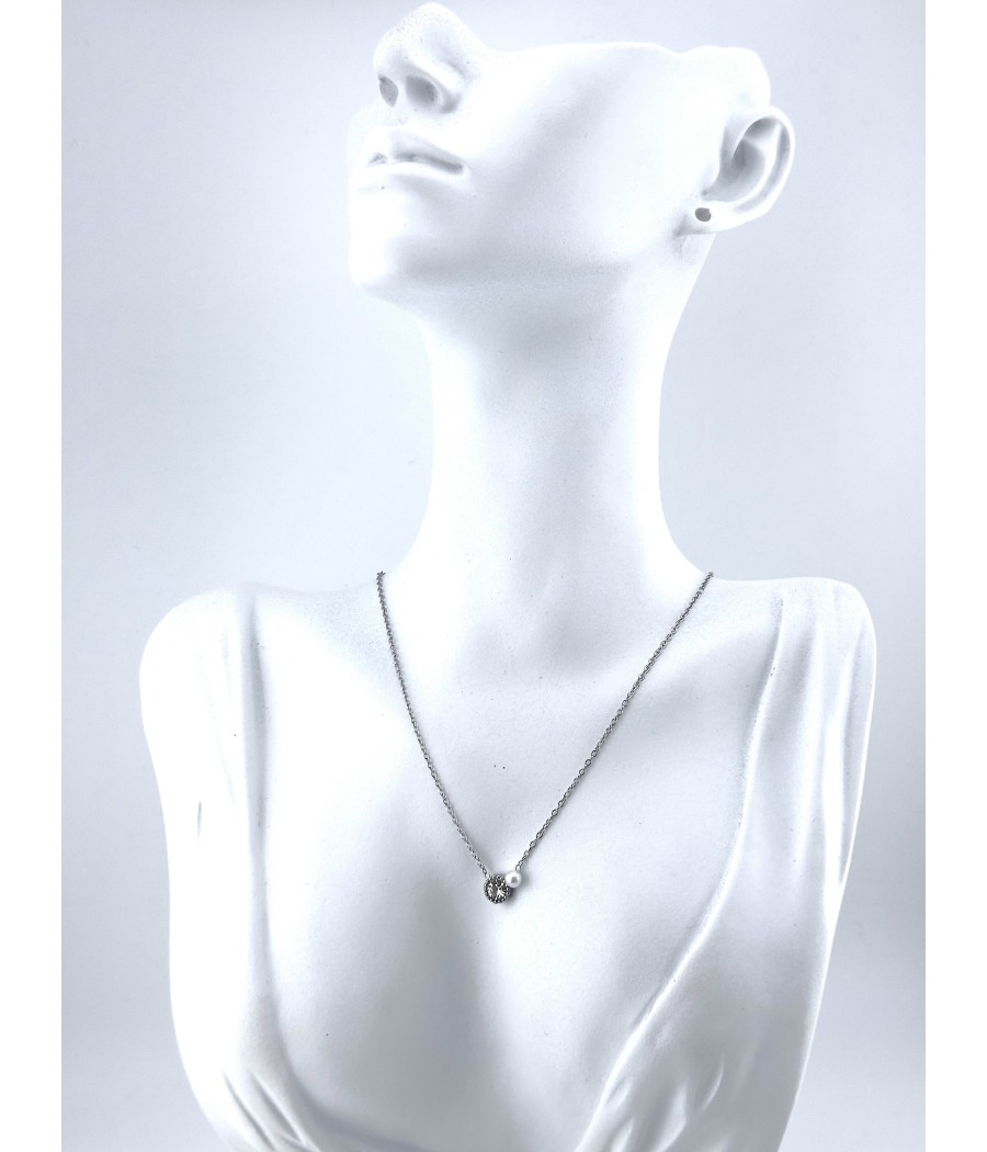 Κλασικό και κομψό κολιέ με στρας και μαργαριτάρι, σε δύο εκδόσεις: ασημί και χρυσό, ιδανικό για δώρο ή καθημερινό στυλ.